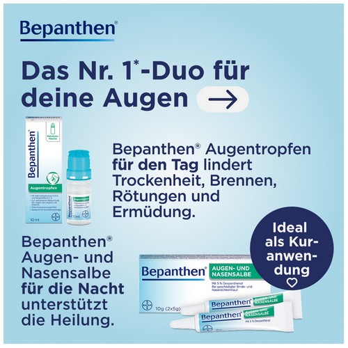 Unterstützen auch Sie Ihre Nase und/oder Ihre Augen bei der Heilung: Bestellen Sie hier noch heute – und rezeptfrei – die Bepanthen® Augen- und Nasensalbe und profitieren Sie von ihren beruhigenden und pflegenden Eigenschaften.