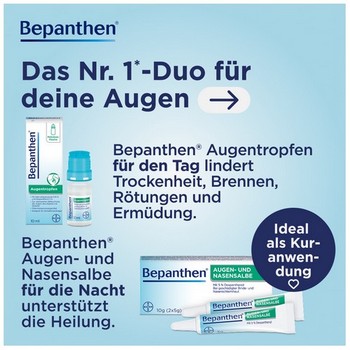 Um den Heilungsprozess im Auge und in der Nase zu unterstützen, enthält die Bepanthen® Augen- und Nasensalbe den Wirkstoff Dexpanthenol. Er fördert die Neubildung von Zellen und kurbelt so die Reparatur des geschädigten Gewebes an. Durch das Auftragen der Salbe wird die Regeneration der Binde- und Hornhaut sowie der Nasenschleimhaut unterstützt und eine schnellere Heilung gefördert.