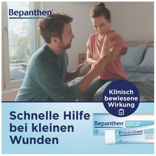 Bepanthen Wund- und Heilsalbe hilft bei kleinen Wunden, trockenen und rissigen Hautstellen, Schürfwunden, Kratzern, Schnitten und Schrunden. Selbst auf Schleimhäuten und im Intimbereich kann Bepanthen Wund- und Heilsalbe angewendet werden. Dabei fördert die Salbe die Produktion neuer Hautzellen und unterstützt so den Heilungsprozess.