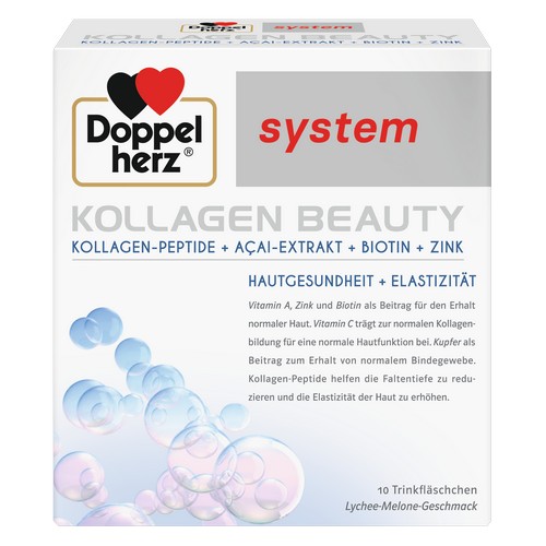 Doppelherz system KOLLAGEN BEAUTY enthält eine Kombination aus ausgesuchten Nährstoffen für natürlich schöne Haut von innen.