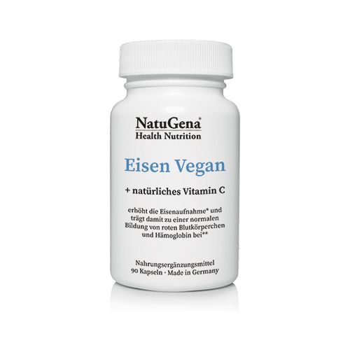 Eisen Vegan besteht aus pflanzlichem Eisen (Curryblatt-Extrakt) und Vitamin C (Acerola-Kirsche) zur Steigerung des Eisengehaltes im Blut.