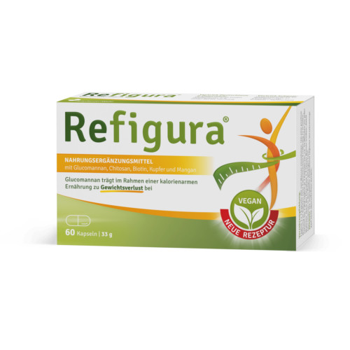 Täglich 3 x 3 Kapseln mit viel Wasser einnehmen, ca. 15 Minuten vor jeder Mahlzeit. Nach der Einnahme 1–2 Gläser Wasser trinken, damit Glucomannan in den Magen gelangen kann. Refigura kann über einen längeren Zeitraum hinweg genommen werden.
