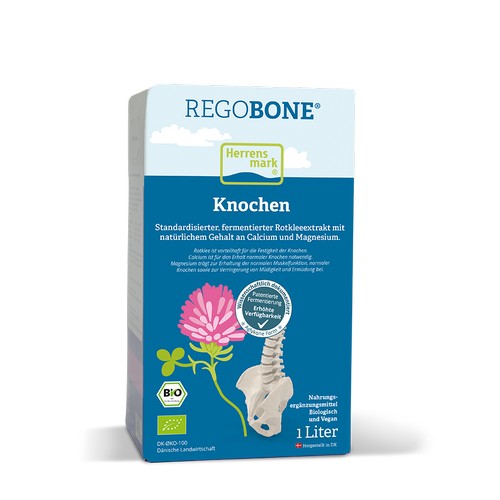 REGOBONE® wird aus frisch geerntetem Rotklee aus dem eigenen Anbau von Herrens Mark auf Fünen hergestellt. Das Produkt ist nicht pasteurisiert und enthält weder Alkohol noch andere Zusatzstoffe. Der Extrakt ist mit Milchsäurebakterien fermentiert und lebendig, sodass Geschmack und Konsistenz von Karton zu Karton variieren können.