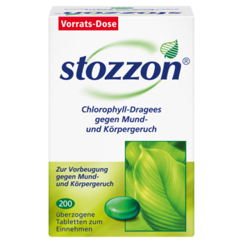 Viele Menschen leiden gelegentlich unter Mund- und Körpergeruch. Das Problem: Man nimmt den unangenehmen Geruch zwar bei anderen, nicht aber bei sich selbst wahr. Die Ursachen für Mund- und Körpergeruch sind vielfältig. So können Stoffwechselerkrankungen, Magen- und Darmstörungen, Entzündungen im Mund- und Rachenraum sowie andere Erkrankungen der Auslöser sein - ebenso wie Stress und seelische Belastung. Und jeder, der gern Knoblauch oder Zwiebeln isst, weiß, dass dies am nächsten Tag zu einer erheblichen Geruchsbelästigung der Mitmenschen führt. Was wenig bekannt ist: Auch Diäten oder unausgewogene Ernährung können durch den dadurch bedingten veränderten Stoffwechsel zu Mundgeruch führen. Der in Stozzon enthaltene Wirkstoff Chlorophyllin hat geruchsneutralisierende Eigenschaften. Der Wirkstoff aus dem natürlichen Blattgrün kann die Aktivität bestimmter eiweiß-spaltender Enzyme vermindern und auf diesem Wege die Bildung übler Gerüche hemmen. So können stozzon Chlorophyll-Dragees unangenehme Gerüche von innen heraus verhindern, noch bevor sie entstehen.