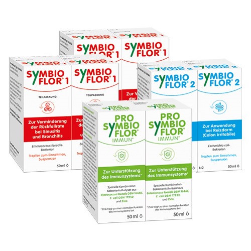 - Symbioflor 1: 2 Flaschen (= 100 ml): 2×20 Tropfen täglich